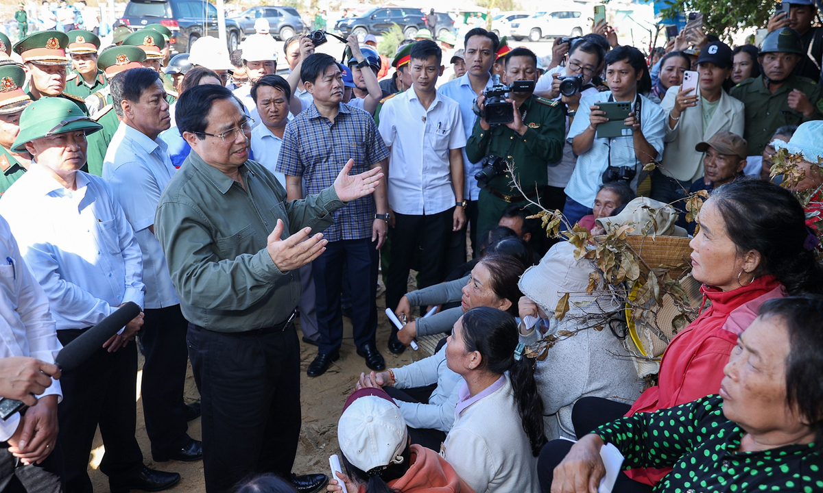 Thủ tướng thăm hỏi, động viên các hộ dân bị thiệt hại nặng tại xã Đề Gi, tỉnh Gia Lai vào sáng 13/11. (Ảnh: VGP)