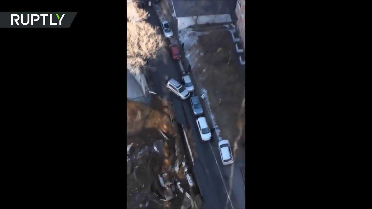 Cảnh quay từ trên cao cho thấy hố tử thần khổng lồ sâu khoảng 20m, rộng 10m há miệng nuốt chửng một con đường ở thành phố Vladivostok, Nga hôm 14/2 (giờ địa phương).