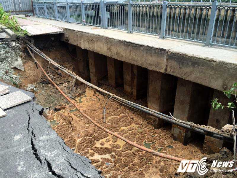 Phần móng bờ kè kênh Nhiêu Lôc – Thị Nghè với phần đường Trường Sa lộ thiên. Cáp điện và cáp viễn thông đi ngầm dưới đất bị lộ ra, phần đất xung quanh một trụ đèn tại khu vực này cũng bị kéo tuột xuống.