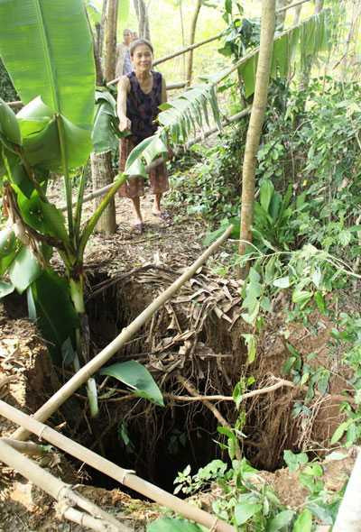 Chỉ sau một đêm mưa lớn, một "hố tử thần" bề mặt rộng trên 2 m, đáy rộng hơn 5 m và sâu gần 10 m bất ngờ xuất hiện trong vườn nhà bà Lê Thị Bông và có nguy cơ tiếp tục lan rộng.
