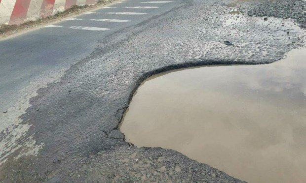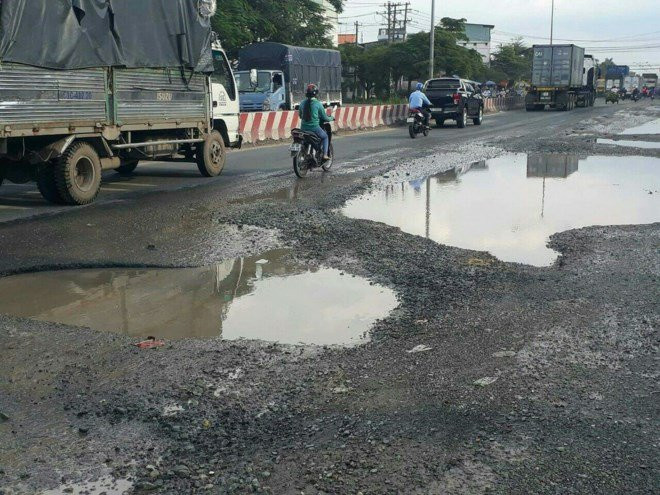 Nhiều vết loang lổ lớn nằm giữa đường, ngập úng khi trời mưa, tạo thành những chiếc “ao sâu” đang đe dọa tính mạng của người đi đường.