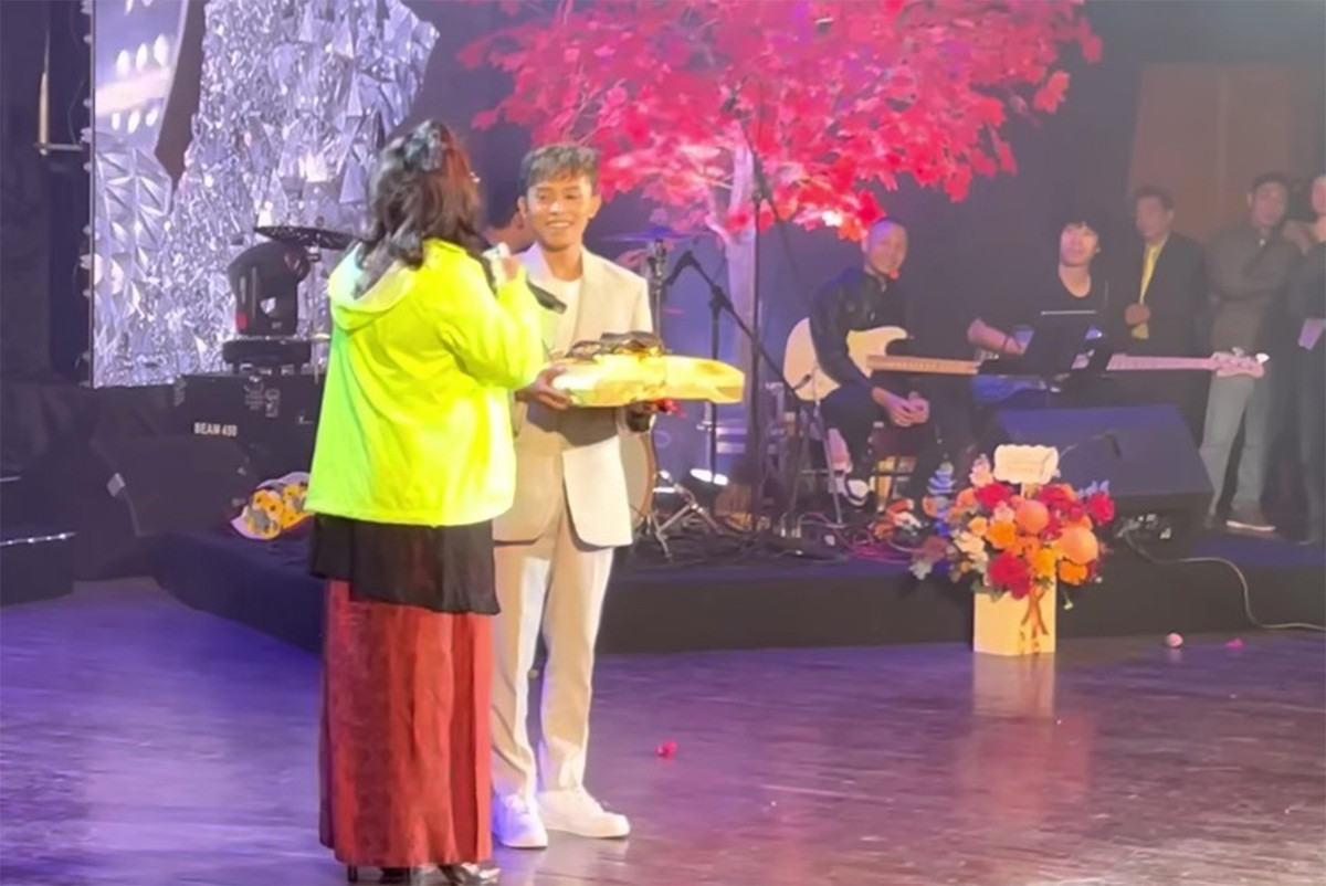 Người hâm mộ lên sân khấu tặng vàng cho Hồ Văn Cường. (Ảnh cắt từ clip)
