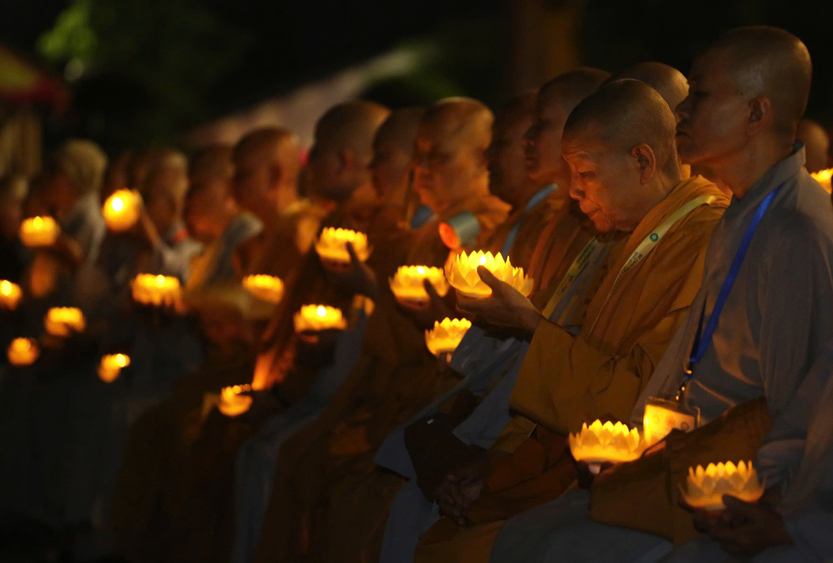 Ánh sáng phát ra từ hoa đăng tạo nên không gian huyền ảo nhưng vẫn uy nghiêm, thể hiện tinh thần của Đại lễ Vesak 2025.