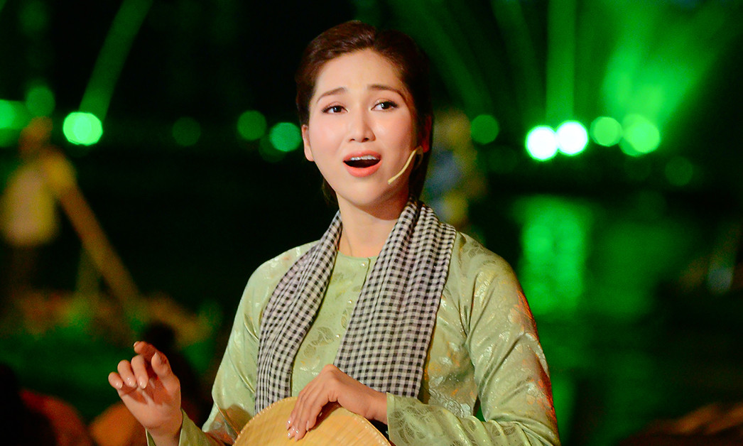 Trên sân khấu Dòng sông kể chuyện, ca sĩ Như Huỳnh diện trang phục áo bà ba, khăn rằn quàng cổ - biểu tượng đồng hành qua bao tháng năm với người dân nơi đây. Cô làm nên nét đẹp duyên dáng, mộc mạc của đất và người phương Nam.