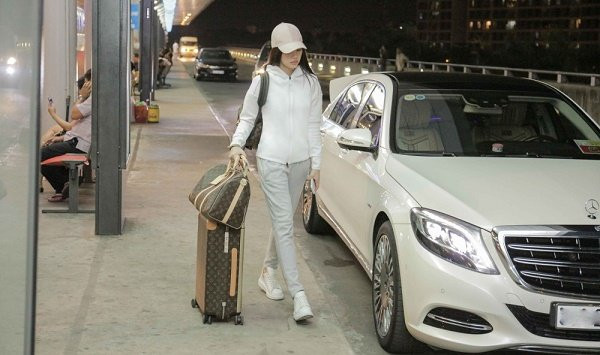 Sau khi được xe sang đưa đến sân bay, người đẹp tự lấy hành lý và di chuyển vào trong.
