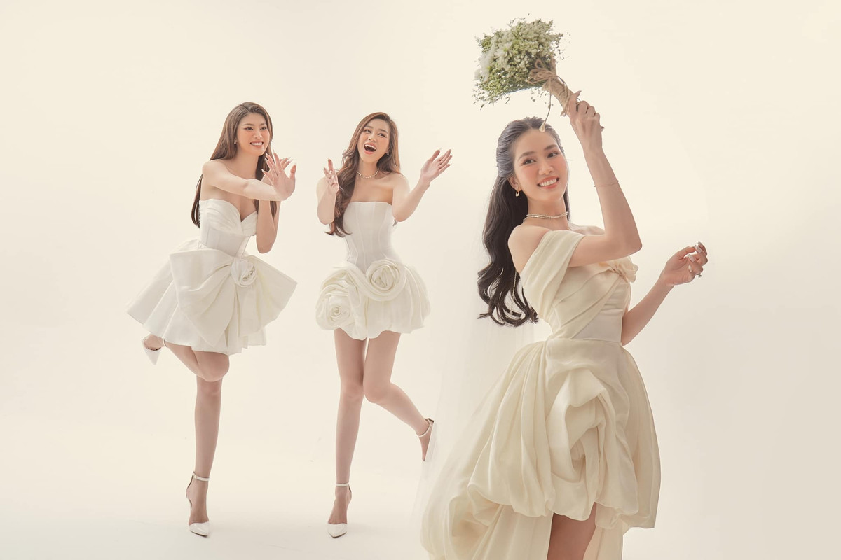Trước đó, Phương Anh cũng rủ Hoa hậu Đỗ Thị Hà và Á hậu Ngọc Thảo xuất hiện trong bộ ảnh cưới của mình. Cả 3 cùng diện váy trắng xinh đẹp rạng rỡ.