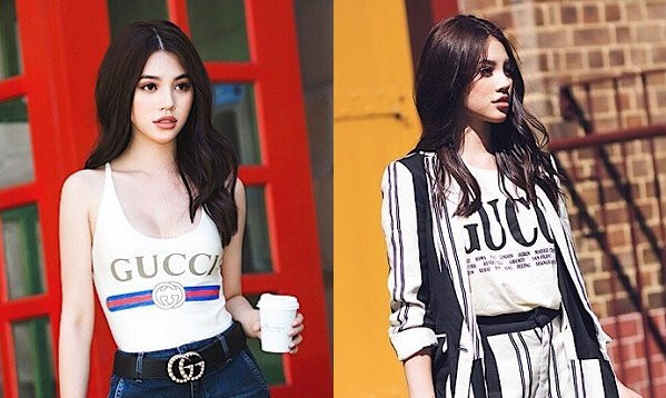 Những chiếc áo thun in họa tiết nổi bật là một trong những xu hướng thời trang hứa hẹn sẽ tạo nên cơn sốt trong mùa hè 2018. Jolie Nguyễn kết hợp chiếc áo bodysuit của thương hiệu Gucci với quần jean lung cao để tôn lên đôi chân dài và vòng eo thon gọn.
