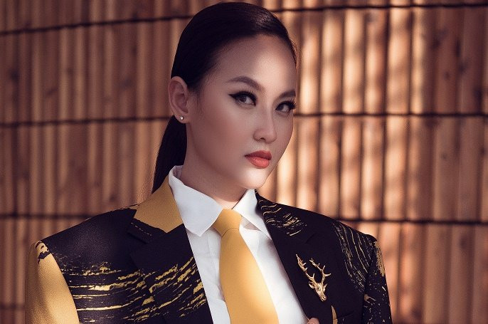 Bộ vest với họa tiết màu vàng - đen ấn tượng được Khánh Ngân kết hợp với sơ mi trắng, cà vạt màu vàng... giúp cô trở nên nổi bật, đầy thu hút.