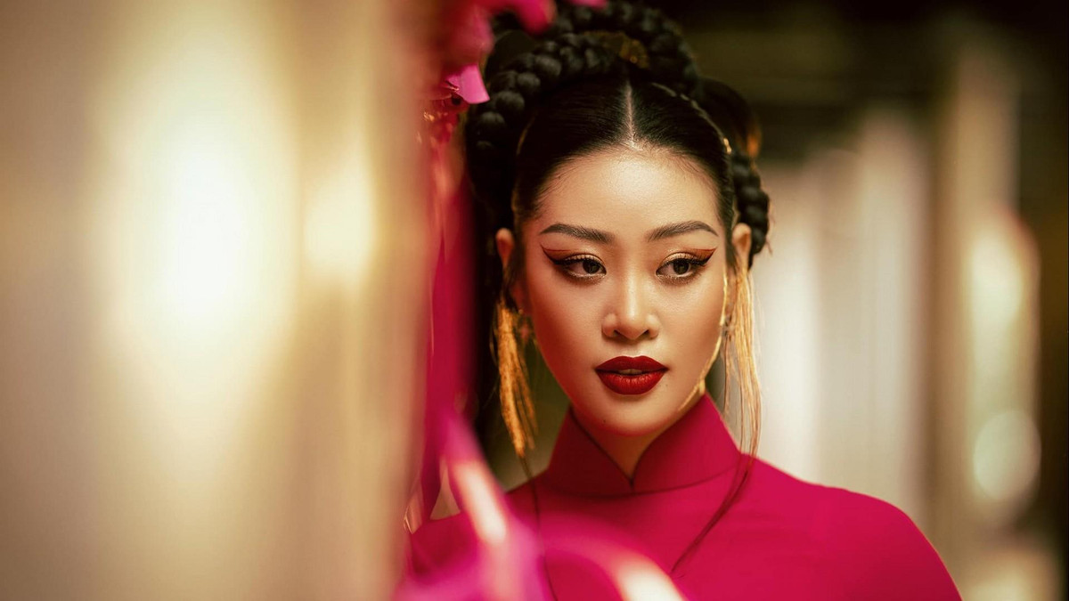 Diện trên người tà áo dài truyền thống, Hoa hậu Khánh Vân duyên dáng thướt tha kết hợp cùng kiểu tóc cách điệu lấy cảm hứng từ hình tượng rồng trong dân gian Việt Nam. Chọn áo dài màu đỏ và hồng – những sắc màu rực rỡ đại diện cho những lời chúc tốt ngày năm mới, Hoa hậu Khánh Vân muốn lưu giữ khoảnh khắc đặc biệt nhất của năm – những ngày cuối năm chuẩn bị đón giao thừa, lòng hân hoan mong ngóng nhưng cũng bồi hồi nhìn lại những chuyện trong một năm qua.