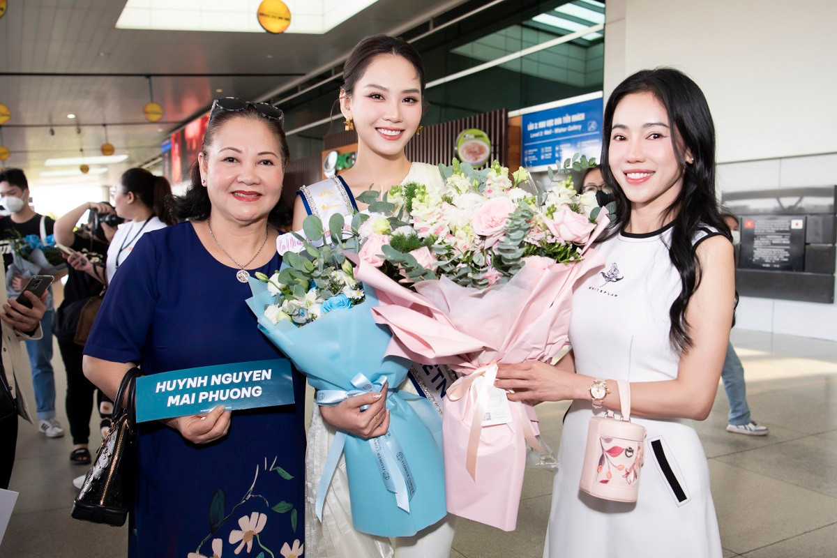 Mẹ ruột (bên trái) và CEO Kim Dung cũng có mặt để tiễn Mai Phương. Bà Kim Dung nhận định: "Mai Phương là một cô gái hội tủ đủ các yếu tố: Xinh đẹp, tài năng, cá tính, học thức. Rất mong quý khán giả có thể dõi theo hành trình của bạn ấy tại Miss World năm nay".