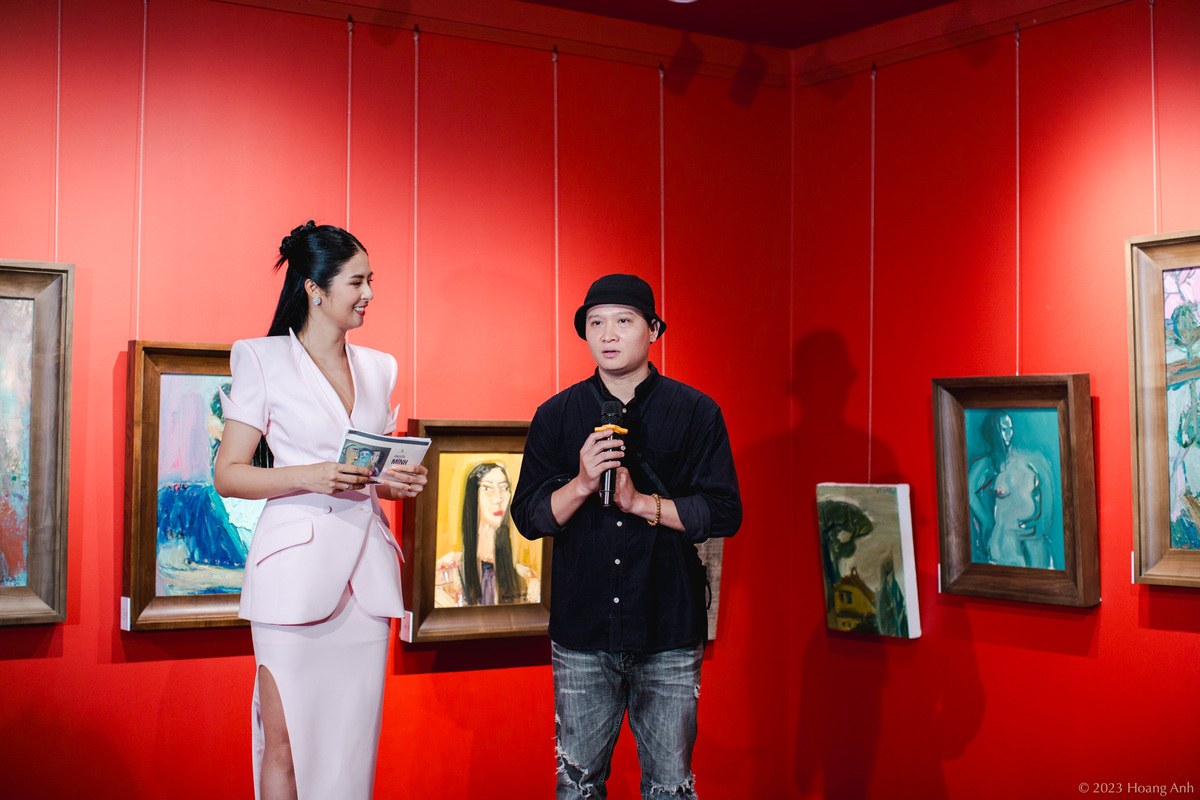 Giám tuyển Lê Thiết Cương chia sẻ với Ngọc Hân, MC của buổi khai mạc. Cô đồng thời cũng là người tổ chức triển lãm tranh cho họa sĩ Đoàn Đức Hùng tại Đà Lạt.