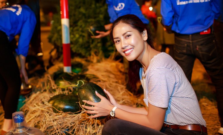 Hoa hậu Nguyễn Thị Loan mua dưa ủng hộ bà con miền Trung.