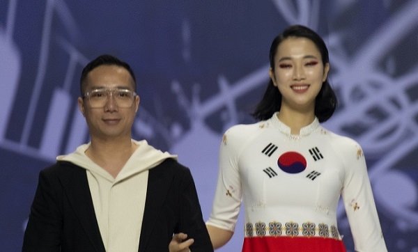 Hoa hậu nhân ái Thủy Tiên đảm nhận vai trò vedette cho đêm diễn, xuất hiện trong trang phục áo dài có họa tiết là quốc kỳ Hàn Quốc. Chia sẻ về thiết kế đặc biệt này, Đỗ Trịnh Hoài Nam cho biết việc thể hiện văn hóa Việt Nam là điều đương nhiên nhưng anh cũng muốn tôn vinh các nước bạn trong một sân chơi quốc tế. (Ảnh: Vũ Đình Hải)
