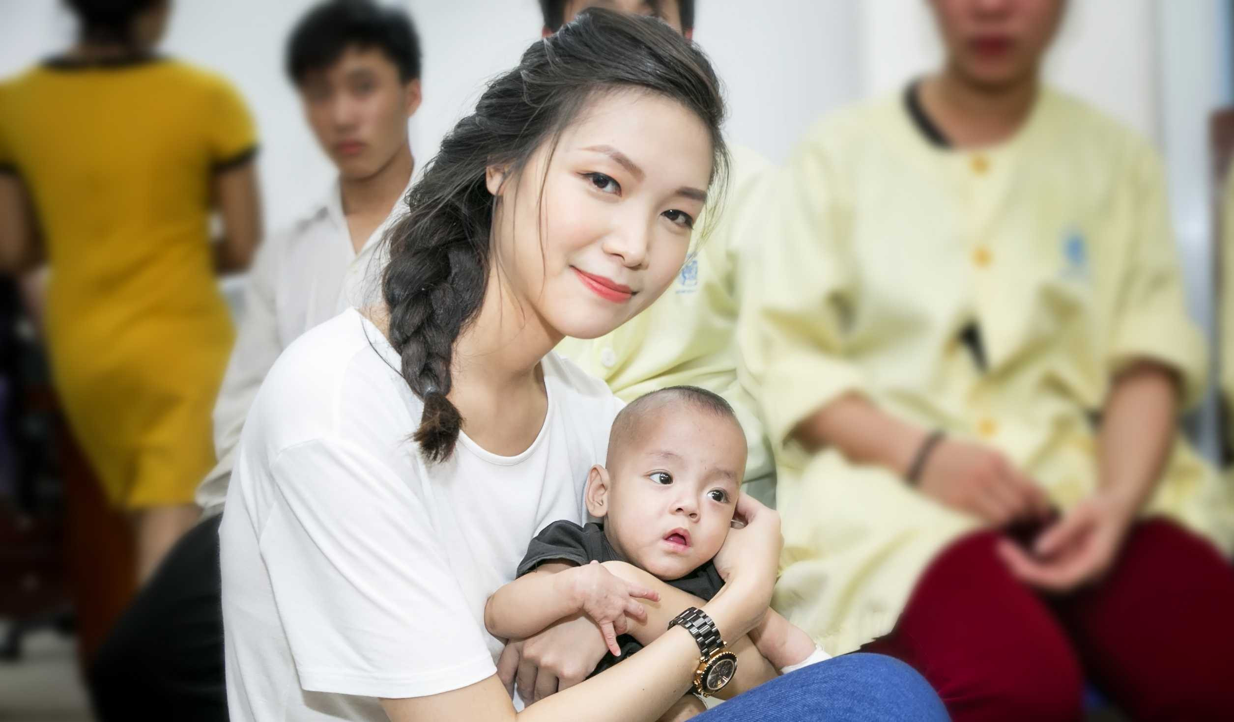 Hoa hậu Thùy Dung không kìm được nước mắt khi trao quà từ thiện cho bệnh nhi đang điều trị tại bệnh viện Nhi TW.