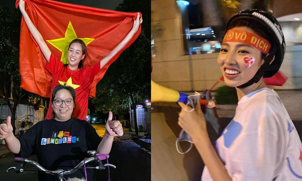 Hoa hậu Kỳ Duyên mặc áo cờ đỏ sao vàng ăn mừng chiến thắng. "Tui đã mặc sẵn áo vào phút thứ 89 rồi. Việt Nam vô địch! Chiến thắng trọn vẹn cho nước nhà", cô viết.