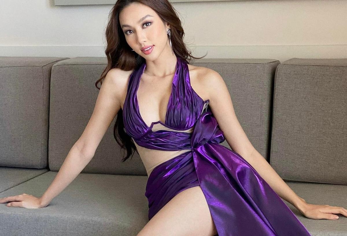 Hoa hậu Hòa bình Thế giới 2021 diện đầm lụa cut-out màu tím gợi cảm, khoe trọn đường cong nóng bỏng và đôi chân thon dài gợi cảm.