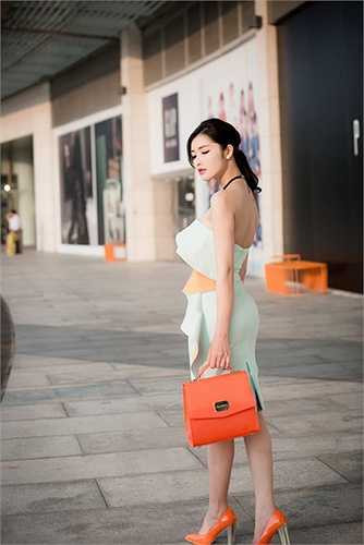 Đầm ôm với những chi tiết cách điệu được phối hợp màu sắc hài hòa với phụ kiện là giày và túi xách khiến Triệu Thị Hà trở nên nổi bật, trẻ trung trên phố.