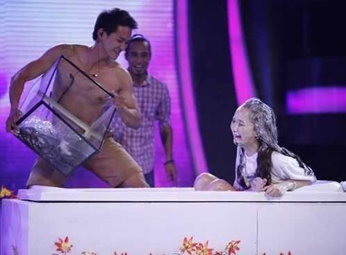 Nhìn thấy người của ban tổ chức chuẩn bị đổ một thùng những con vật lạ vào bồn tắm lạnh, Thảo My đã không thể giữ được bình tĩnh và òa khóc kêu trời.