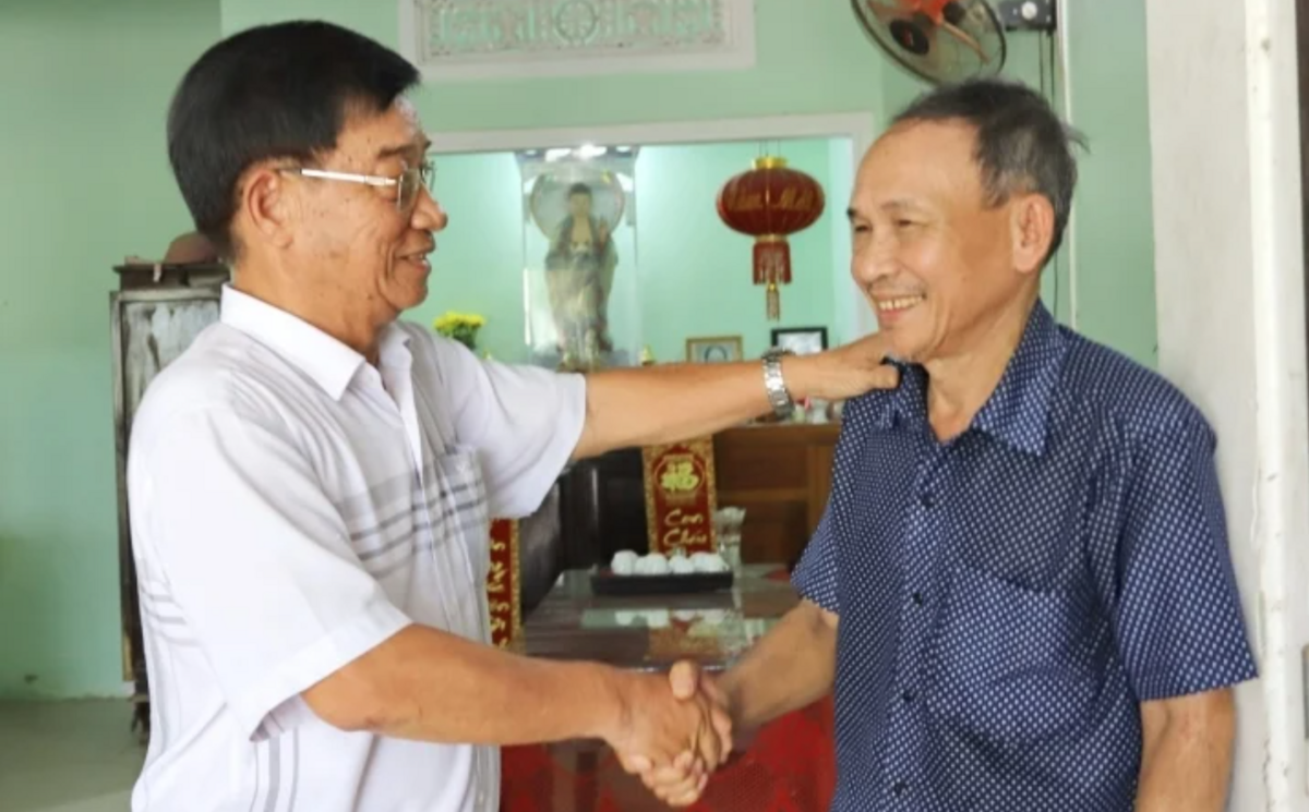 Ông Nguyễn Khánh Sơn, từng là du kích xã Đại Lãnh, nguyên Trưởng Ban Dân vận Huyện ủy Đại Lộc thăm hỏi ông Đỗ Minh Long ở xã Đại Lãnh, huyện Đại Lộc