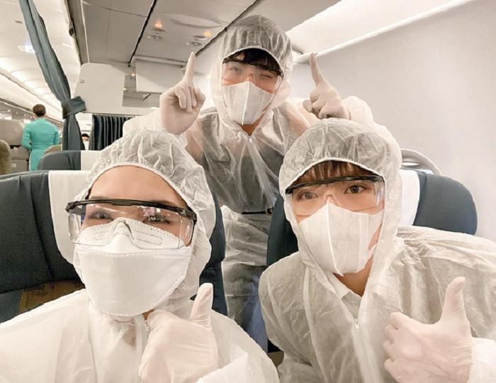 Đức Phúc khoe ảnh anh cùng Hòa Minzy, Erik mặc đồ bảo hộ kín đáo với găng tay, mắt kính và khẩu trang chuyên dụng. Bộ ba Hoa dâm bụt vui vẻ chụp ảnh khi ngồi trên máy bay ra Hà Nội.