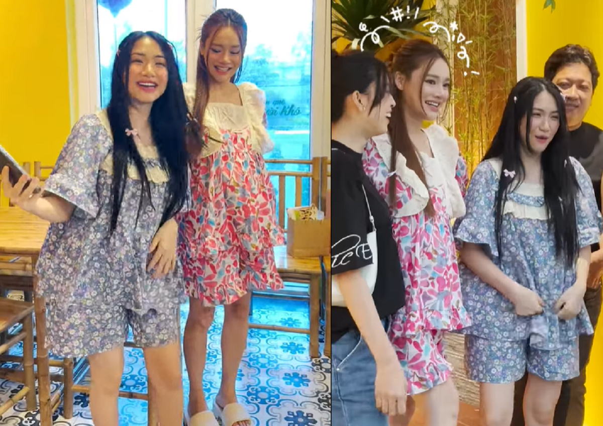 Cụ thể, khi tham gia chúc mừng sinh nhật Tiểu Vy cùng vợ chồng Trường Giang, Hòa Minzy diện bộ đồ ngủ khá rộng, cùng kiểu dáng với trang phục mà Nhã Phương đang diện.