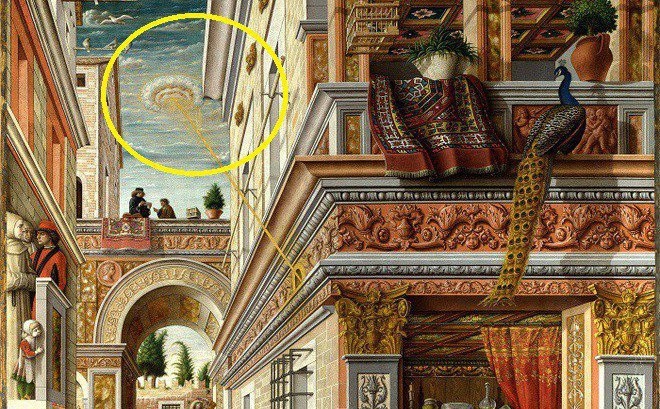 Chúng ta thấy khó hiểu là trong bức tranh này, họa sĩ Carlo Crivelli vẽ đám mây khác với thực tế bầu trời đầy mây. Ông vẽ đám mây "hình đĩa" với "thiên thần" và chùm ánh sáng.