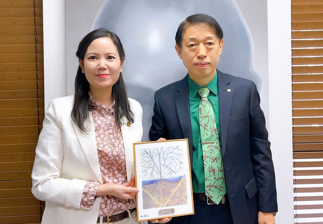 Cũng trong dịp này, hoạ sĩ Kim Đức tặng Chủ tịch Kwang soo Lee bản in bức tranh Vỏ tương lai với thông điệp bảo vệ thiên nhiên trước biến đổi khí hậu mà thế giới đang phải gánh chịu.