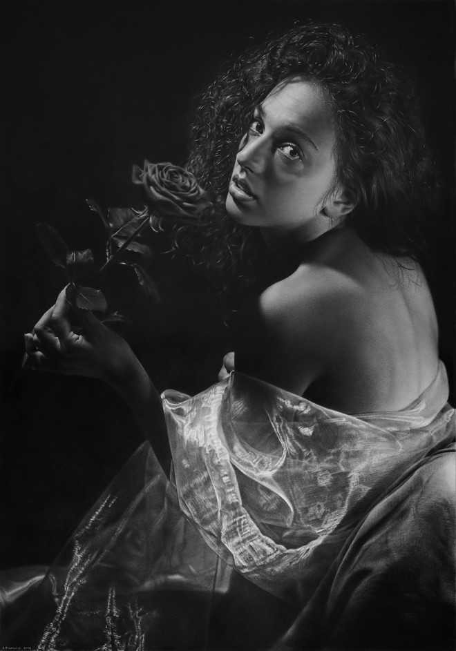 | Từ những kiến thức quý báu tiếp thu được, Dascanio dùng than chì và than củi để tạo ra các bức chân dung mang hơi thở hội họa Phục Hưng, đồng thời dung hòa với chất liệu hiện đại. |