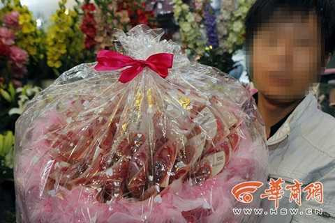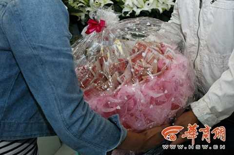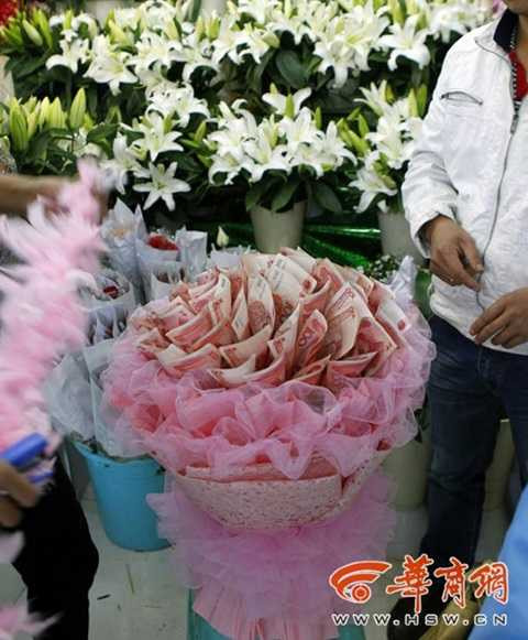 Hãng tin Chinanews mô tả bó ‘hoa tiền thật’ được gói rất cầu kỳ, bên ngoài dùng giấy và lưới màu hồng tạo khung cho bó hoa, bên trong là 50 tờ mệnh giá 100 nhân dân tệ được xếp ngay ngắn.