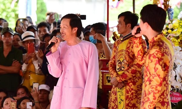 Do quan viên là nữ nên Hoài Linh không đứng ngôi chủ tế. Thay vào đó, danh hài đóng vai trò như một người phục vụ dù diện áo dài đỏ. Anh chỉnh áo cho chủ tế Thoại Mỹ, nhắc nhở khi quan viên chưa đứng đúng vị trí và cũng không ngại cuộn chiếu khi lễ chính đã kết thúc.