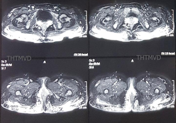 PGS.TS Nguyễn Hồng Hà, Trưởng khoa Phẫu thuật – Tạo hình – Thẩm mỹ, Bệnh viện Hữu nghị Việt Đức cho biết, bệnh nhân vào viện trong tình trạng mệt mỏi, lo lắng, thiếu máu nhẹ. Vùng mông có hiện tượng viêm sưng nề nhiều, xen kẽ các vết thủng loét đã vỡ rò chảy mủ ra ngoài. Phim chụp cộng hưởng từ MRI 3.0 cho thấy, hàng trăm khối u siliconoma cùng hiện tượng viêm lan tỏa trong lớp da cơ mông và thâm nhiễm đến gần hậu môn.