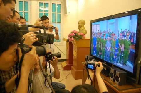 | Các phóng viên tác nghiệp tại tòa. Ảnh: Nguyễn Dũng |