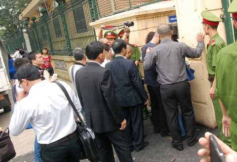 7h30 phút, trước cổng trụ sở TAND TP Hà Nội, thân nhân các bị cáo, các luật sư tham gia bào chữa đã có mặt, thực hiện các thủ tục để qua cổng bảo vệ vào trong.