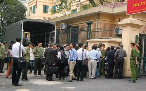 An ninh trong khu vực này được thắt chặt khi hàng chục cảnh sát từ các lực lượng bảo vệ, CSGT, tự vệ... được điều động để giữ gìn trật tự. Cách cổng Tòa không xa, một chiếc xe chữa cháy chuyên nghiệp cũng được điều động để bảo vệ phiên tòa.