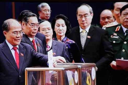 | Các ông Nguyễn Sinh Hùng, Lê Hồng Anh, Nguyễn Thiện Nhân, bà Nguyễn Thị Kim Ngân... bỏ phiếu. (Ảnh: Quang Tùng) |