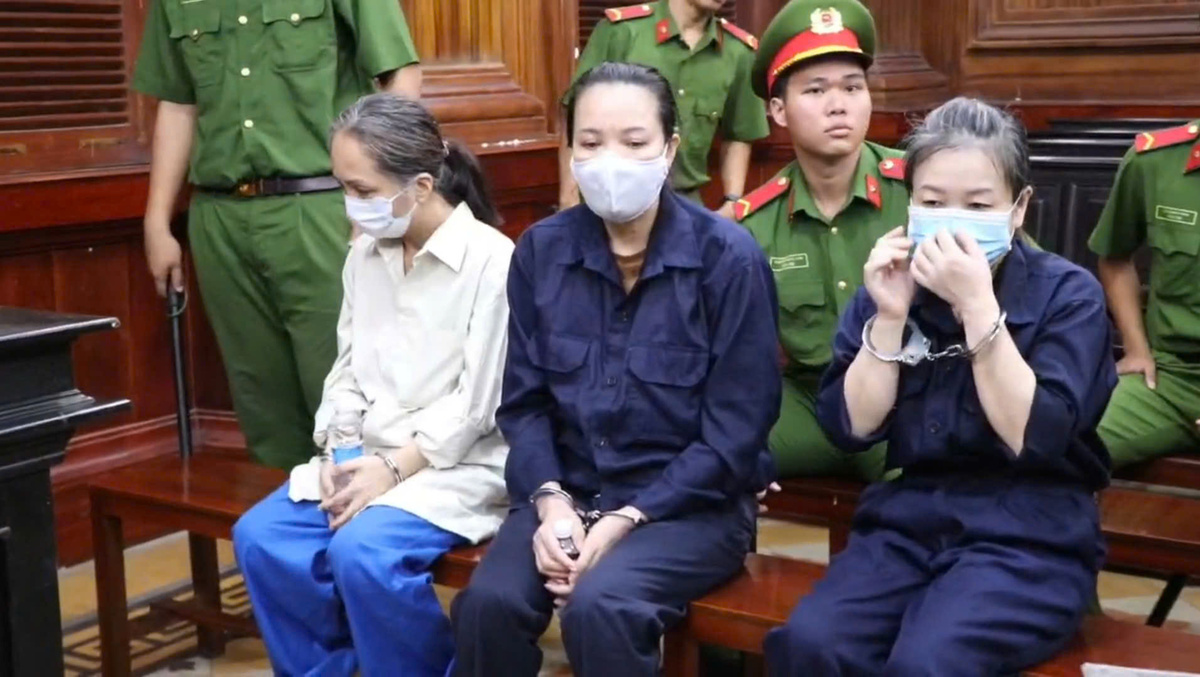 Bị cáo Giáp Thị Sông Hương (giữa) - chủ Mái ấm Hoa Hồng và đồng phạm tại tòa sáng nay.