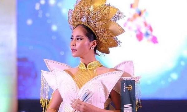 Bộ trang phục dân tộc của đại diện Việt Nam đính 5.000 viên pha lê, tà trước vẽ tay phong cảnh Tây Bắc hùng vĩ, tà sau dựng 3D cả hồ sen gây ấn tượng mạnh.