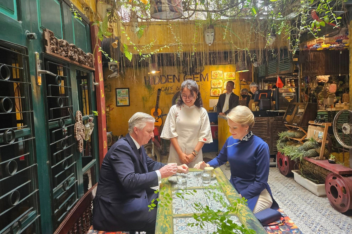 Trong bộ áo dài Việt Nam màu xanh lam, Hoàng hậu Mathilde đã cùng Nhà vua Philippe thưởng thức cà phê trứng.