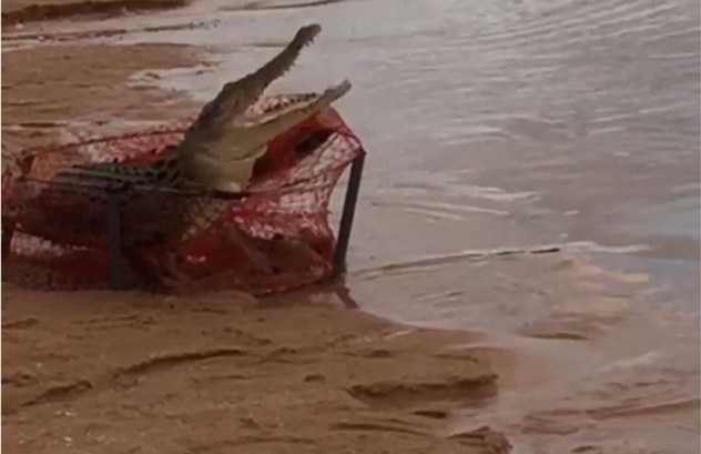 Một nhóm ngư dân ở Cape York, bang Queensland, Úc đã hoảng hồn khi phát hiện con cá sấu nước mặn dài 2 mét nằm trọn trong chiếc lưới vốn được họ dùng để bắt cua.
