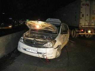 Lúc 19h ngày 28/8, chiếc taxi Petrolimex BKS 56K – 8752 do tài xế Nguyễn Hùng Khanh (37 tuổi, ngụ Q.7) điều khiển vừa chạy chạy qua cầu Đồng Nai chừng 100m (theo hướng QL1A, TPHCM - Đồng Nai) bất ngờ lần lượt 3 bánh xe bị nổ. Chiếc taxi nổ bánh, húc mạnh vào dải phân cách, quay ngược đầu lại trên QL1A. May mắn không va chạm với xe đầu kéo container đang chạy cùng chiều. Ảnh: Phan Cường