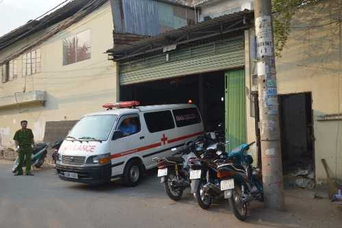 | Xe cứu thương chuyển thi thể nạn nhân đi khám nghiệm |