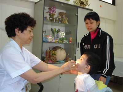 | Các vết loét dễ dàng phát hiện khi khám họng cho bệnh nhi. Ảnh: H.Hải |
