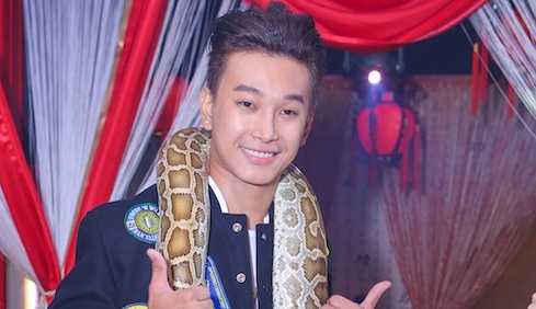 | Hoàng Kỳ Nam gây 'sốc' khi đem trăn đến buổi họp báo. |