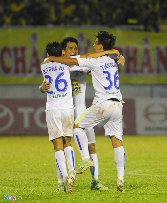 Hoàng Thiên sút phạt từ khoảng cách chừng 20 m. Bóng khẽ chạm hàng rào SLNA và đổi hướng khiến thủ môn Nguyên Mạnh không thể cản phá.