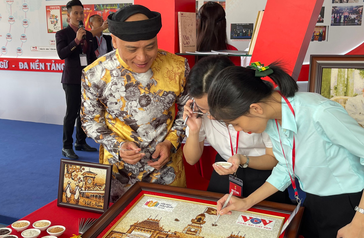 Tại gian hàng, hoạt động ghép tranh gạo logo VOV với nghệ nhân thu hút sự chú ý của nhiều người có mặt. Các PV, BTV của Đài Tiếng nói Việt Nam hào hứng khi được góp một phần công sức tạo nên bức tranh.