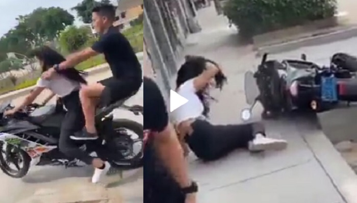 Cả chàng trai can đảm dám ngồi sau xe cô gái cũng ngã lăn quay.