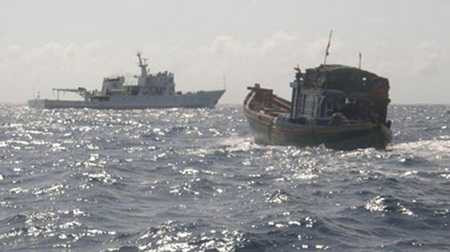 | Một tàu cá Việt Nam bị tàu tuần tra Trung Quốc (trái) áp sát ở quần đảo Hoàng Sa - Ảnh: THX |