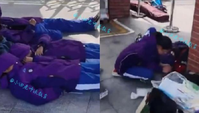 Học sinh nằm cổng trường ăn vạ. (Ảnh: Weibo)