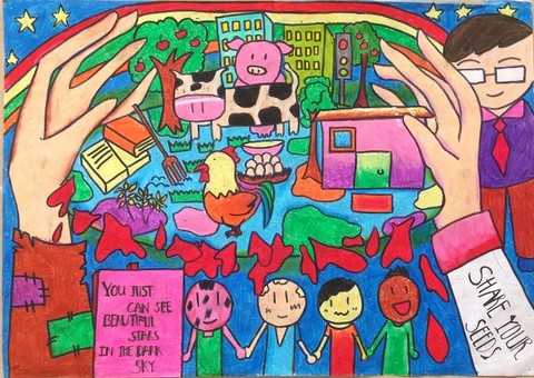 | Đặc biệt, rất nhiều tác giả nhí trong Triển lãm đã thể hiện suy nghĩ sâu sắc khi tập trung đưa ra những giải pháp gốc rễ của vấn đề, trong đó nhấn mạnh tới việc phổ cập giáo dục, nâng cao tri thức cho người nông dân. Bức tranh “Share your seeds” của Nhật Vy, học sinh lớp 8A3 đã gây ấn tượng với người tham quan triển lãm khi thể hiện mong muốn trao cho người nông dân những “hạt mầm” của sự ấm no là cơ hội học tập, thu nạp kiến thức để người nông dân làm chủ việc sản xuất ra nguồn lương thực thực phẩm. “Để biết cách sản xuất ra nhiều hơn lúa gạo, phát triển nông nghiệp và có một cuộc sống tốt đẹp hơn thì người nông dân cần được học tập nhiều hơn. Gốc rễ của đói nghèo là đói nghèo về tri thức” Nhật Vy chia sẻ. |