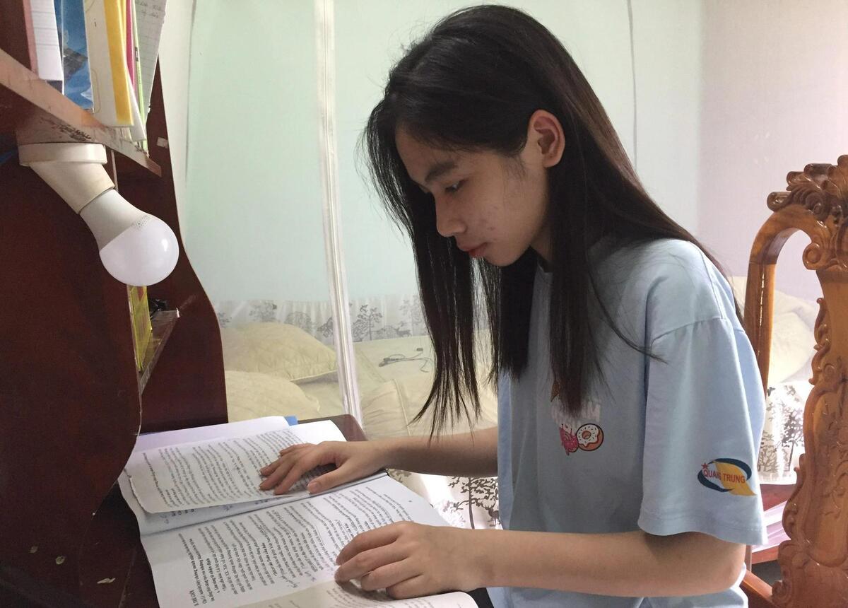 Nguyễn Thu Hà, học sinh lớp 11D, trường THPT chuyên Quang Trung (tỉnh Bình Phước), tận dụng thời gian nghỉ lễ để ôn tập thi cuối học kỳ II. (Ảnh: Nguyễn Hằng)
